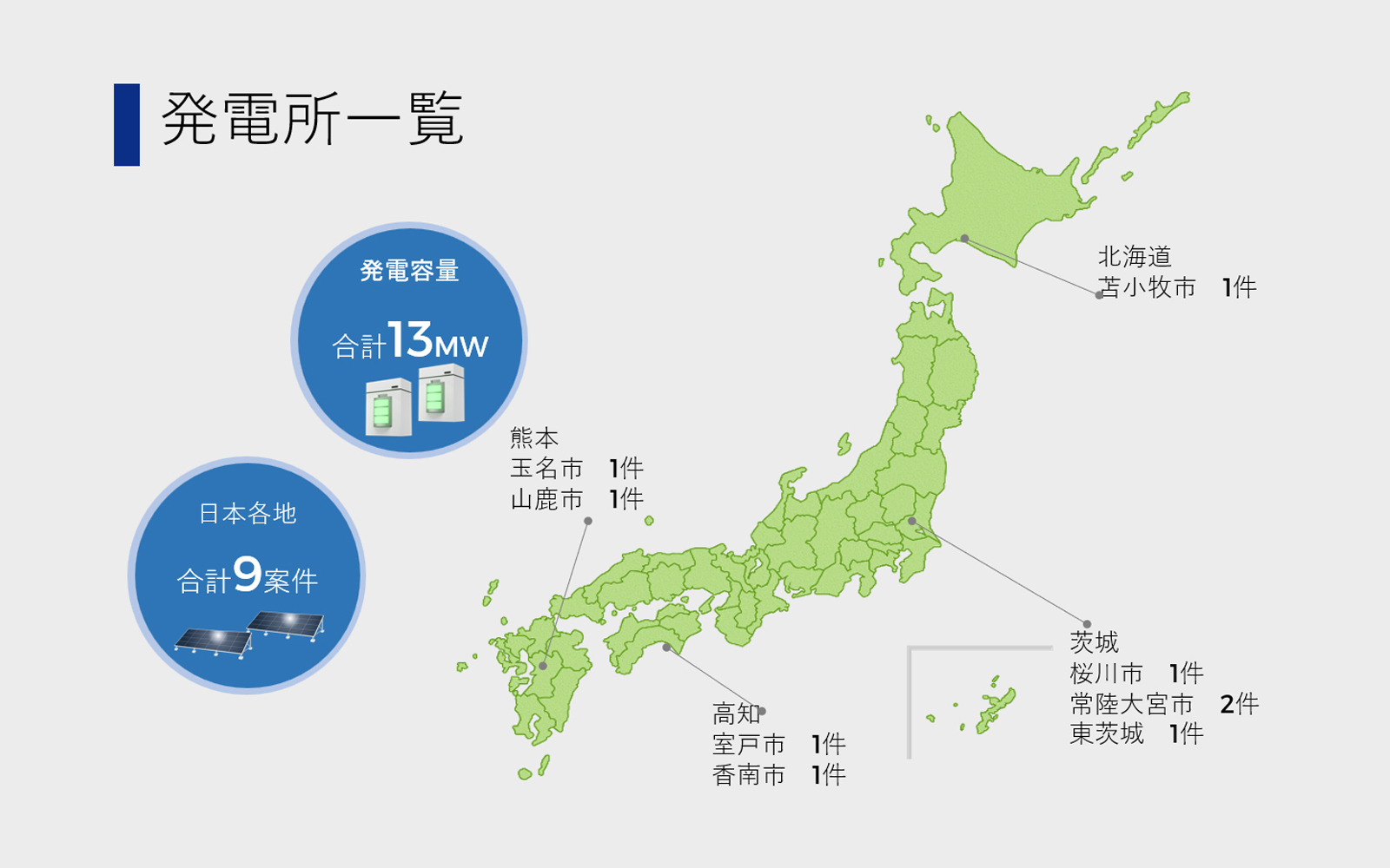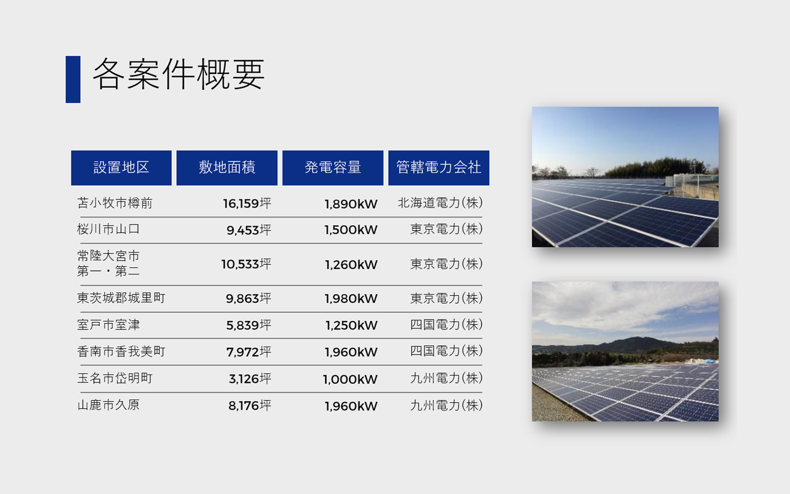 不動産開発のノウハウと、不動産金融で培ったストラクチャードファイナンスの技術を駆使して、北海道から九州まで全9案件、投資総額50億円の規模にて、太陽光発電案件を組成、取得、開発、運用して参りました。